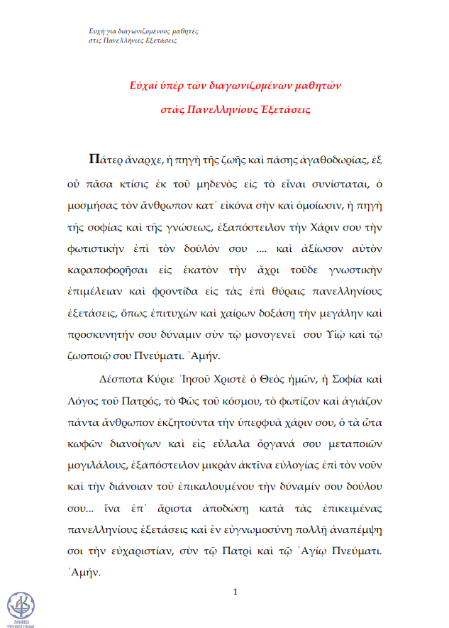 Ευχή για διαγωνιζομένους μαθητές στις Πανελλήνιες Εξετάσεις