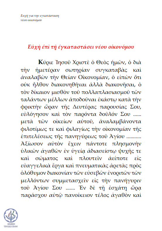 Ευχή για την εγκατάσταση νέου οικονόμου